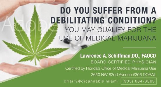 Dr. Schiffman is Board certified and registered by the State of Florida to provide medical marijuana recommendations to eligible patients. Those with debilitating conditions may be able to obtain this safe, effective medication. As the opioid epidemic continues unabated, medical marijuana may be an alternative to synthetic pain pills and other medications with many dangerous side effects.